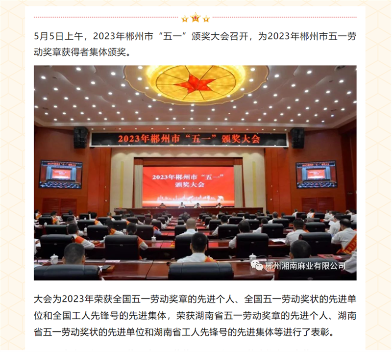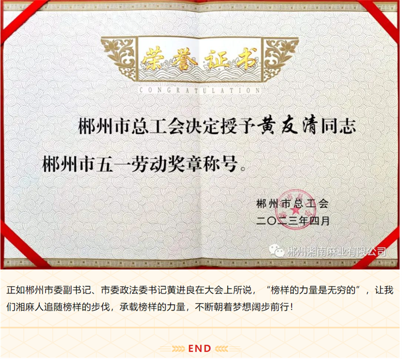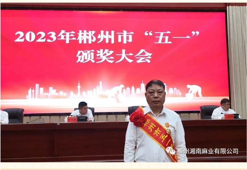 喜報丨郴州湘南麻業(yè)黃友清同志榮獲“郴州市五一勞動獎章”光榮稱號